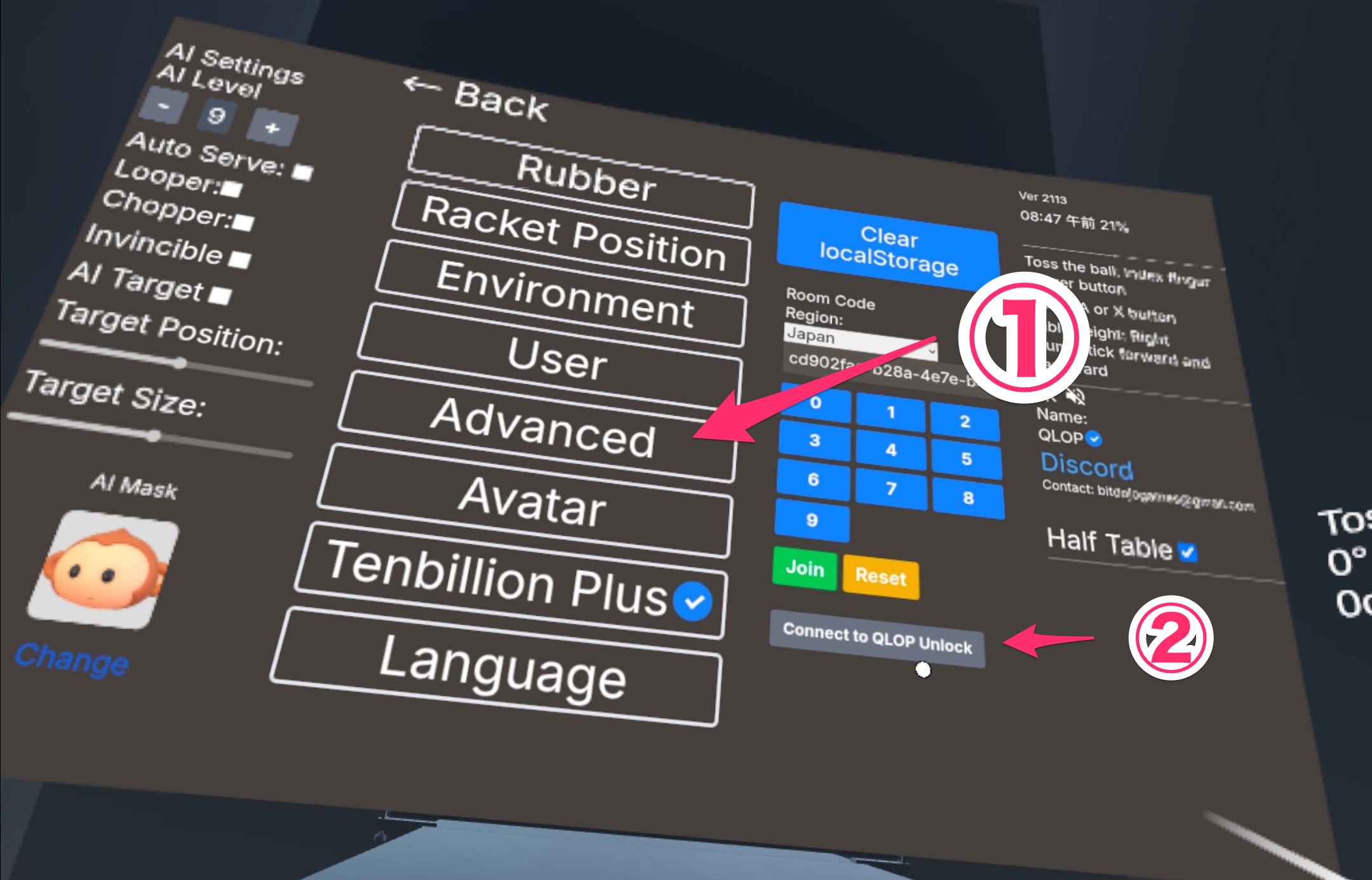 • Tenbillion Table Tennisのアプリ内で、設定>詳細設定>Connect to QLOP Unlock をクリックしてください。
